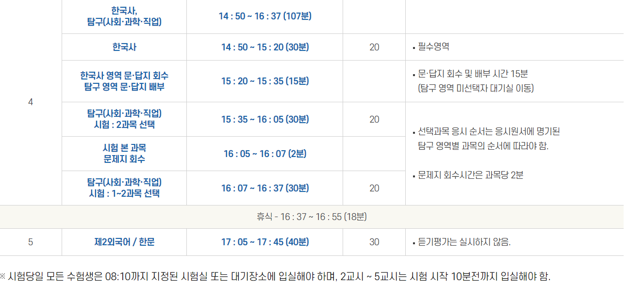 각 시험 교시마다 정해진 시간 동안 준비를 철저히 하세요. 쉬는 시간 동안에는 마스크 착용 및 거리두기 등 시험장 규칙을 잘 지키며 잠시나마 긴장을 풀고 재충전하는 시간을 가지는 것이 좋습니다.